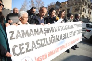 Açıklamada, “Zaman aşımı katliamı unutturmaz cezasızlığı kabul etmiyoruz!” pankartı açıldı ve İHD Eş Genel Başkanı Oya Ersoy ile çok sayıda kişi katıldı.