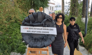 Muğla Yaşam Hakkı Savunucuları Platformu, 4 Ekim nedeniyle Bodrum’da sessiz bir protesto gerçekleştirdi. Siyah kıyafetler giyen yurttaşlar, “4 Ekim Hayvanları Koruma değil, Hesap Sorma Günüdür” yazılı siyah çelengi Bodrum Belediyesi’nin önüne bıraktı.