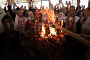 Konuşmaların ardından büyük bir coşkuyla siyasetçiler tarafından Newroz ateşi yakıldı. Ardından Koma Vejîn ve Hozan Arhat’ın seslendirdiği stranlar eşliğinde uzun süre halay çekildi. Newroz çekilen halaylarla devam ediyor.