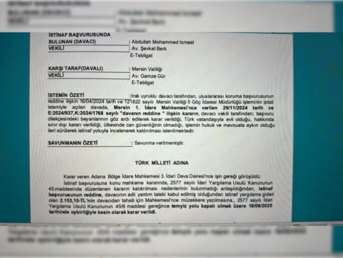 “Babam ticaret yapıyordu, Irak sınırında çalışırken annemle evlenmiş. Ben 5 yaşındayken annem ve babam bombardımanda öldü. Amcalarım sahip çıkmadı, 15 yaşına kadar farklı evlerde kalarak büyüdüm. Daha sonra çobanlık ve inşaat işlerinde çalıştım. Ankara’da bana ‘kimliksiz olunmaz’ dediler, başvuru yaptım. Ama akrabalarım destek olmayınca devlet beni incelemeye aldı ve mülteci kimliği verdi. 20 yıldır her hafta imza atıyorum. Açtığım davalar reddedildi. Şimdi sınır dışı edilmek isteniyorum. Ben Iraklı değilim, Türkiye vatandaşıyım. Şu anda vatansızım. Vatandaşlığımın verilmesini, sesimin duyulmasını istiyorum.”