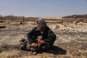 Yaz aylarında çıkan orman yangınları Türkiye’deki birçok şehri etkiledi. AP, Çanakkale’ye bağlı Güzeleli’ndeki yangında ölen hayvanlarından birinin yanında ağlayan 64 yaşındaki çiftçi Turkan Özkan’ın fotoğrafını da paylaştı.
