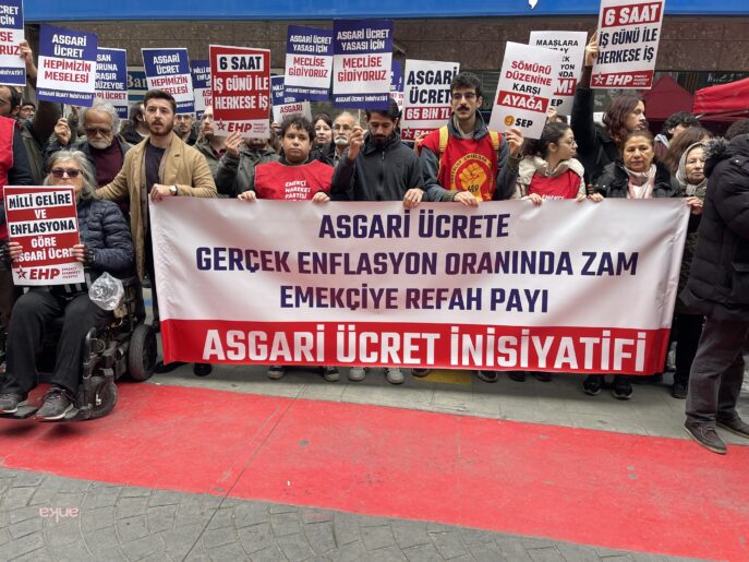 “Asgari ücrete gerçek enflasyon oranında zam emekçiye refah payı” pankartının açıldığı açıklamada, “Sömürü düzenine karşı ayağa kalk”, “6 saat iş günü ile herkese iş”, “Milli gelire ve enflasyona göre asgari ücret”, “Emekçiyi yok sayan hiçbir düzen ayakta kalmaz” dövizleri taşındı.