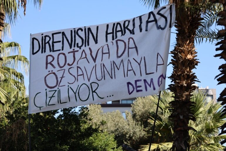 Halkların Eşitlik ve Demokrasi Partisi (DEM Parti) Sözcüsü Ayşegül Doğan’ın katılımıyla Akdeniz ilçesinde bulunan ve Mersin’in simgelerinden biri olan 52 katlı Metropol Park binası önünde gerçekleşen eylemde, sık sık “Rojava katliamlara geçit vermeyeceğiz”, “Direniş haritası Rojava’da öz savunmayla veriliyor” pankartı açıldı.
