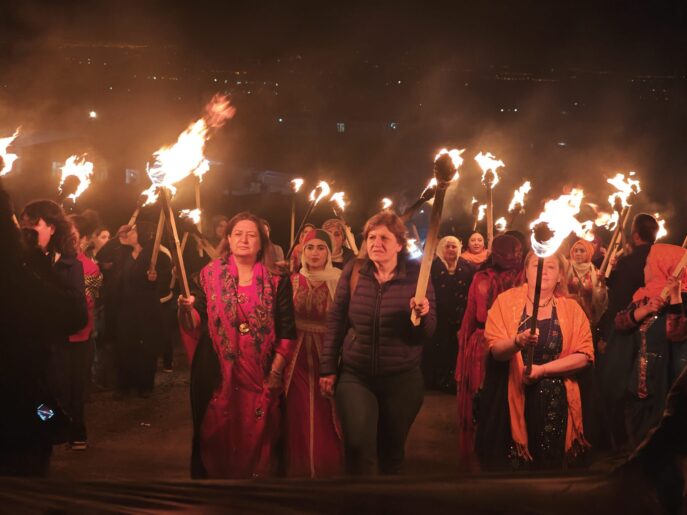 Yürüyüş düzenleyerek meşaleleri taşıyan kadınlar, Newroz ateşini birlikte yaktı.
