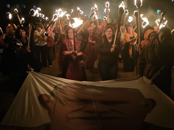 Köy meydanında düzenlenen etkinlikte, Abdullah Öcalan’ın yaşını temsilen 77 meşale yakıldı.