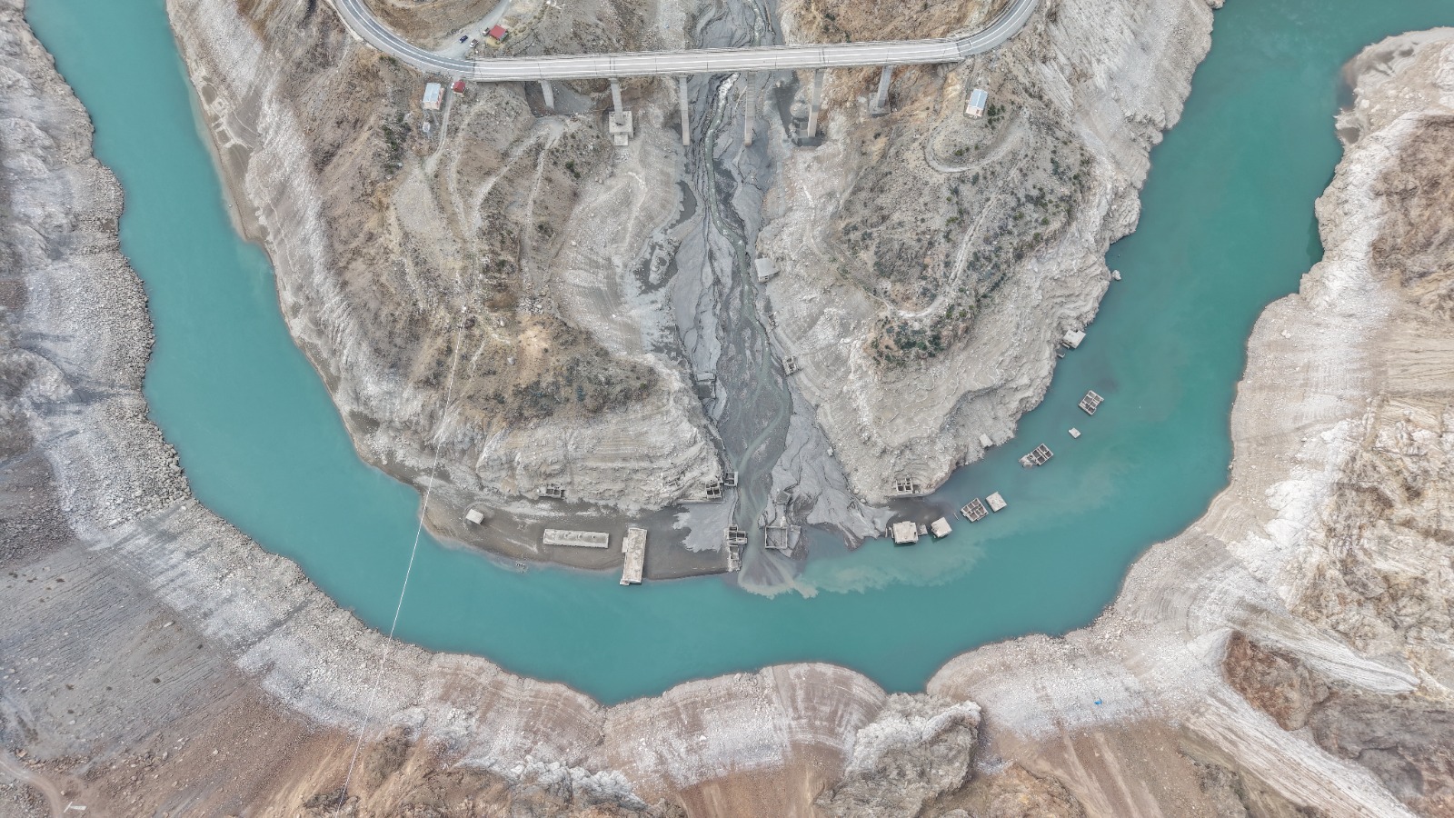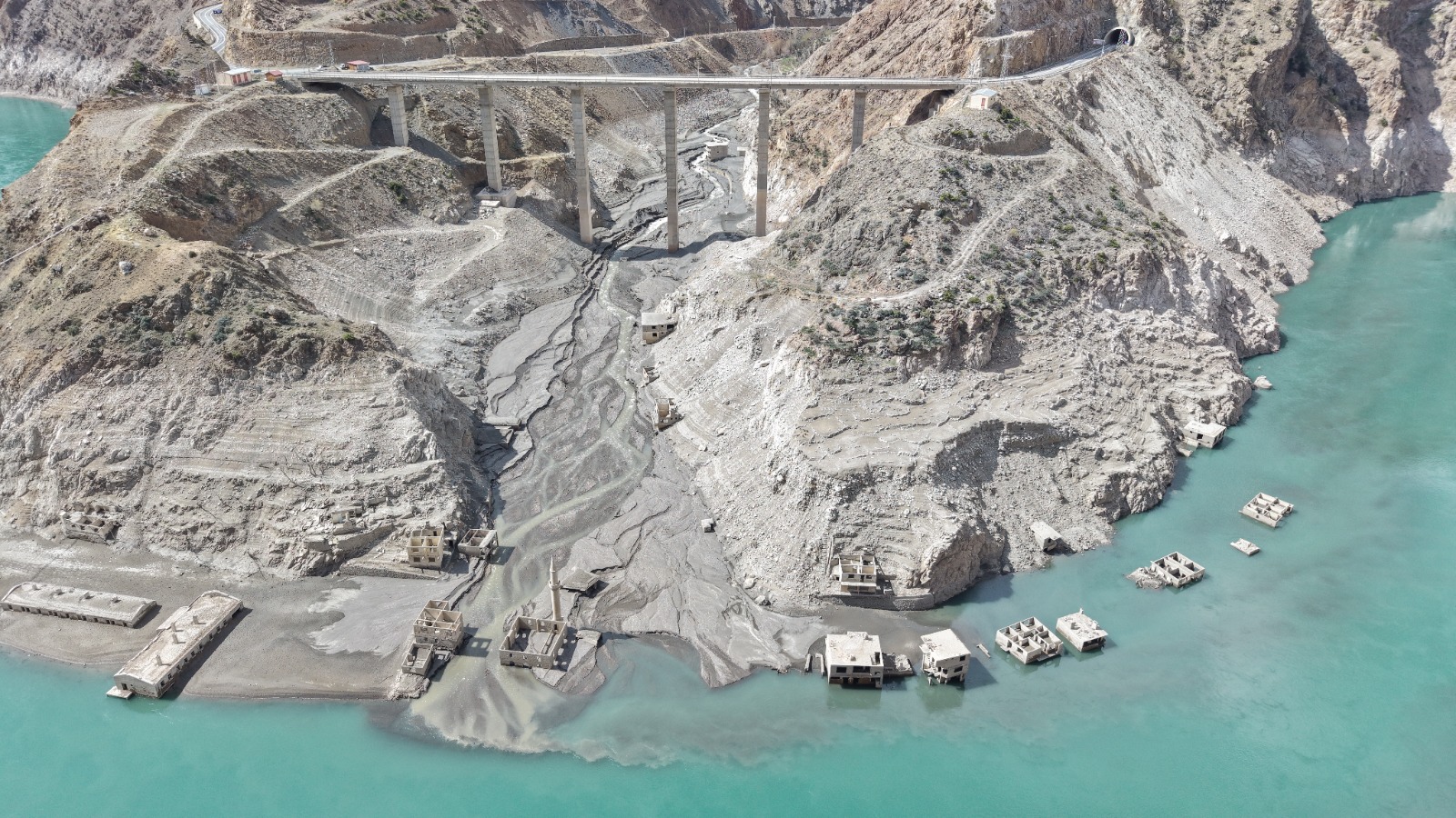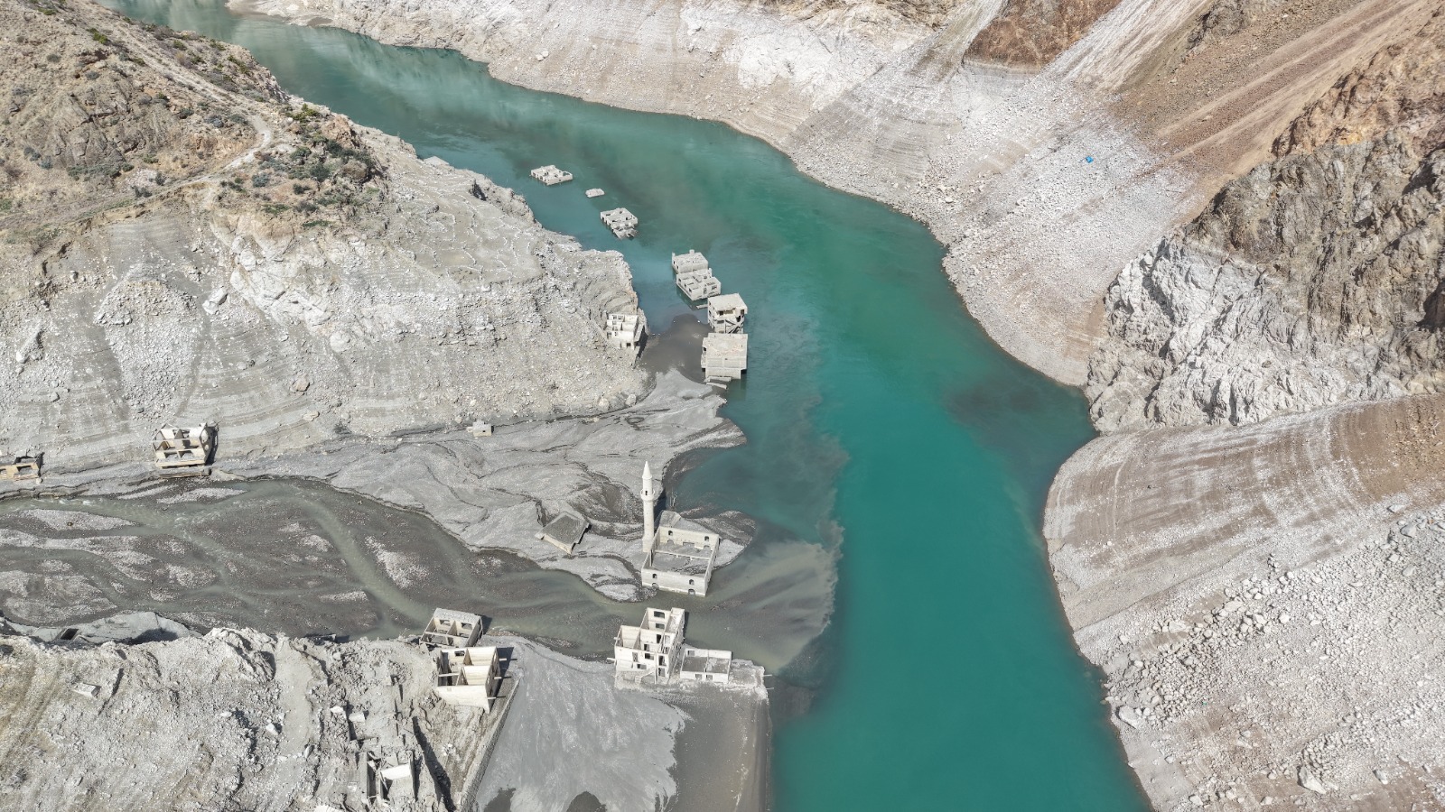 Su seviyesinin azalmasının ardından 2010’da boşaltılan Narlık köyündeki ev, cami ve bir dönem zeytinyağı üretiminde kullanılan fabrika gibi yapılar yeniden ortaya çıktı.