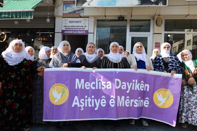Mersin Barış Anneleri Meclisi DEM Parti Akdeniz ilçe binası önünde bir açıklama gerçekleştirdi. Mersin Barış Anneleri Meclisi üyesi Emine Eren, Halep’de yaşanan katliamı kınayarak, “Bir kez daha dünya ve insanlığa sesleniyoruz; Ben insanım, vicdanlıyım ve insan haklarını savunuyorum diyen herkes elini barışa uzatsın” dedi.