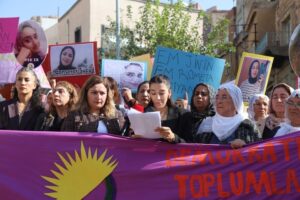 Açıklamada, “Demokratik toplumla şiddetsiz özgür yaşama” pankartı ile erkek şiddetiyle katledilen kadın ve çocukların fotoğrafları taşındı.
