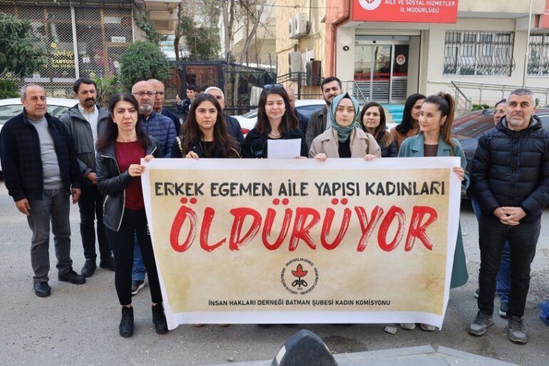İHD Batman Şubesi, 8 Mart Dünya kadınlar Günü nedeniyle Aile ve Sosyal Hizmetler İl Müdürlüğü binası önünde açıklama yaptı. Emek ve Demokrasi Platformu bileşenlerinin de katıldığı açıklamada “Erkek egemen aile yapısı kadınları öldürüyor” pankartı açıldı.