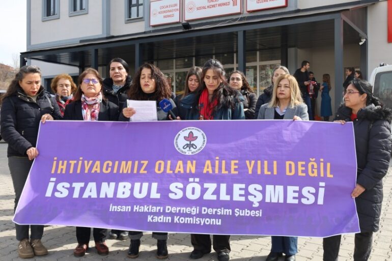 İHD Dersim Şubesi, son süreçte artan kadın cinayetlerine ilişkin Tunceli Aile ve Sosyal Hizmetler Müdürlüğü önünde açıklama yaptı. Açıklamaya kentte bulunan siyasi parti ve sivil l toplum örgütü temsilcileri ve çok sayıda kadın katıldı. “ İhtiyacımız olan aile yılı değil İstanbul Sözleşmesi” pankartı ardından konuşan İHD Dersim Şube Eşbaşkanı Nurşat Yeşil, ortak metni okudu.