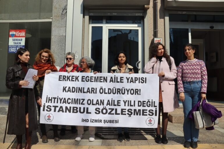 İHD İzmir Şubesi, kadına yönelik şiddete ilişkin taleplerini dile getirmek için İzmir Aile ve Sosyal Hizmetler İl Müdürlüğü önünde basın açıklaması düzenledi. “Erkek egemen aile yapısı kadınları öldürüyor! İhtiyacımız olan aile yılı değil İstanbul Sözleşmesi” pankartının açıldığı açıklamanın basın metnini İHD İzmir Şubesi yöneticisi avukat Nazlı Turan okudu.