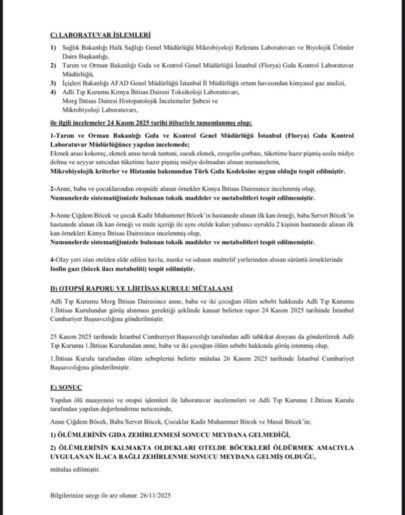 Adli Tıp Kurumu’nun raporuna göre, Kadir Muhammet Böcek (6), Masal Böcek (3), anne Çiğdem Böcek ve baba Servet Böcek’in ölümü gıda zehirlenmesinden kaynaklanmadı; ölüm sebebi böcek ilacı zehirlenmesi olarak belirlendi.