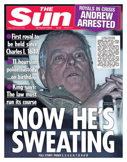 Britanya’nın en çok satan tabloid gazetelerinden The Sun, “İşte şimdi terliyor” başlığıyla çıktı. Gazete üst başlığında, “1647’de I. Charles’tan bu yana gözaltına alınan ilk kraliyet üyesi” ifadesine yer verdi. Manşetteki “İşte şimdi terliyor” ifadesi, bir mağdurun ifadesinde Andrew için “çok terliyordu” demesinden geliyor.