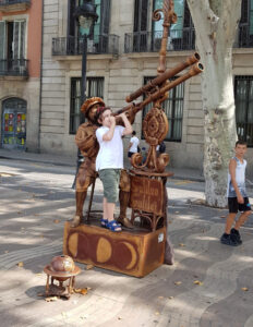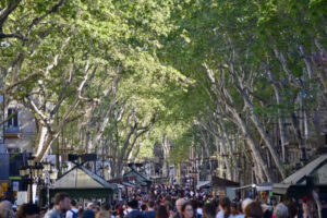 Caddenin Colom Meydanı’na kadar uzanan yaya bölgesi; sokak sanatçıları, ressamlar, hokkabazlar, falcılar, dilenci ve dolandırıcılarla dolu. Catalunya Meydanı’nın her köşesinde rastlayabileceğiniz heykeller, bu caddede yerini canlı heykellere bırakıyor. Çünkü dönemine damga vuran şahsiyetlerin kostüm, makyaj ve aksesuarlarının kandırmaca gösterişinin piyasası oluşmuştur. Bir nevi sosyal dilencilik… Dolayısıyla adım başı bir kahramanla karşılaşmak mümkün. Bir roman karakteri, bir filmden fırlamış kahraman ya da tarihsel bir şahsiyet olabilir bu. Alanın kalabalığını, her iki taraftaki çeşitli mağazalar, marketler, kültürel kurumlar ile kafe ve restaurantlarda müşteri olan farklı milletlerden insanlar tamamlar. Renkli ve evrensel bir görüntünün fotoğrafıyla buluşunca beyin ister istemez bu anı kaydediyor. Sesler, farklı diller, kahkahalar birden tek ses oluyor.
