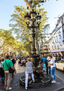 Rambla Caddesi’nde yayalara ayrılan bölge oldukça geniş. Yaya bölgesinin iki yanında, gidiş ve geliş olmak üzere tek şeritlik yol bulunuyor. Her iki yolun iç tarafında kalan alanda ise göğe doğru yükselen ağaçlar var. Catalunya Meydanı yerden yükselen bunaltıcı sıcağa rağmen oldukça serin ve bu serinlik insanların burayı seçmesinde ana etken. Eskiden bir dere yatağıyken çakıl dökülen yolun şimdi düz ve renkli taşlarla döşenmiş olması caddeye görsel bir zenginlik katıyor. Caddede, üzerindeki dört şamdanlı sokak lambasının alt gövdesinde 19. yüzyıldan kalma bir çeşme hemen dikkat çekiyor. Yeterince sıcak olan yaz aylarında serinlemek ve susuzluğu gidermek için bulunmaz bir kaynak. Font de Canalettes adındaki bu çeşmenin, deli dolu akan bir ırmağın düze inip durgunlaşması gibi ele avuca değmesi âdeta bir terapi. Günün mükâfatı ise elini yüzünü yıkamak isteyenlerle şişelerini dolduranların aynı karede olmasıdır.