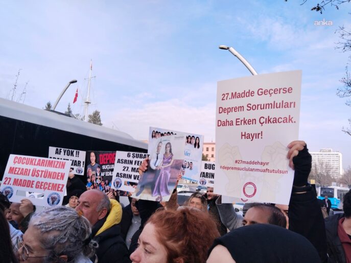 6 Şubat depremlerinde yakınlarını kaybedenlerin oluşturduğu Adalet Peşinde Aileleri Platformu, deprem sanıklarının 11. Yargı Paketi’nin 27. maddesi kapsamından muaf tutulması talebiyle TBMM’nin Dikmen Kapısı önünde açıklama yapmak istedi. Kısa süreli polis engeli yaşandı. Ardından CHP, DEM Parti ve TİP milletvekillerinin diyaloğu sonucu aileler açıklama yaptı.