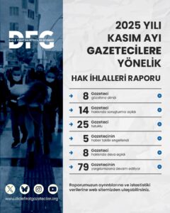 DFG’nin raporuna göre, Kasım ayında 15 gazeteciye 17 yıl hapis cezası verildi, 8’i gözaltına alındı, 8’ine dava açıldı, 14’ü hakkında soruşturma açıldı, daha önce açılan davalar nedeniyle 79 gazetecinin yargılanmasına devam edildi, 91’i işten çıkarıldı.