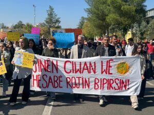 “Bu cinayet sadece Rojin’in değil, hepimizin yaşamına yönelmiş bir saldırıdır” diyen İğin, şunları ekledi: “Çünkü biz biliyoruz: Kadın cinayetleri bireysel değil erkek egemen sistemin sistematik politikalarının sonucudur. Her sessizlik, her cezasızlık kadın katliamlarının önünü açmaktadır. Erkek egemen zihniyetin cinayet alanlarına çevrilen kampüsleri, biz genç kadınlar güvenli eğitim alanlarına dönüştürene kadar mücadelemizi sürdüreceğiz. Biz kadınlar buradan bir kez daha haykırıyoruz: Rojin Kabaiş ölümü neden aydınlatılmıyor? Kimler, neden korunuyor? Rojin’in katledilmesinde payı olan, suçu gizleyen, sessiz kalan herkes hesap vermelidir!”