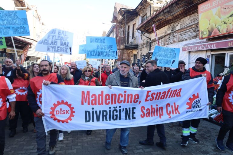 Sivas’ın Divriği ilçesinde maden sahalarının kapanmasına ve işten çıkarılmalarına karşı 18 gündür direnen DİSK/Dev Maden-Sen üyesi işçiler bugün Cumhuriyet Meydanı’na yürüyüş gerçekleştirdi.