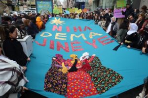 Bu yıl, 8 Mart’ı savaşla, bombalarla karşılayan kadınların olduğunu dile getiren Sebahat Tuncel, “İran Kürdistan’ında, Başûr’da, Lübnan’da, Filistin’de Ortadoğu’da savaş ve çatışma devam ediyor. Oradaki kadın arkadaşlarımıza diyoruz ki: ‘Yalnız değilsiniz, savaşa hayır, barış hemen şimdi.’ Onlar için özgürlük talep ediyoruz. Biz biliyoruz ki savaş ölüm, zulüm demek; ama aynı zamanda işkence şiddet demek. Savaş demek yoksulluk, yoksunluk, açlığa mahkum olmak demek. O yüzden kadınlar olarak savaşa hayır diyoruz, barışı savunuyoruz. Kadınlara yalnız olmadıklarını göstermek için bir ses verelim mi?” şeklinde konuştu.