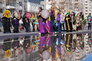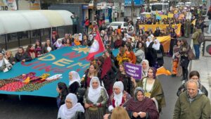 Ofis Semti’nde AZC Plaza önünde yöresel elbiseleriyle bir araya gelen kadınlar, “Niha dema jinê ye”, “Direnişle özgürleşiyor demokratik toplumu örüyoruz” pankartı ve “Jin, jiyan, azadî” sloganlarıyla mitingin düzenleneceği İstasyon Meydanı’na doğru yürüyüşe geçti.