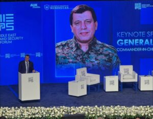 SDG Genel Komutanı Mazlum Abdi’nin konferans salonuna girişinde çekilen bu fotoğraf, günün en ikonik karelerinden biriydi.