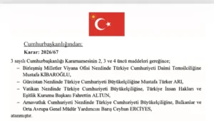 Yayımlanan karara göre; Birleşmiş Milletler Viyana Ofisi Türkiye Cumhuriyeti Daimi Temsilciliğine Mustafa Kibaroğlu, Gürcistan Nezdinde Türkiye Cumhuriyeti Büyükelçiliği’ne Mustafa Türker Arı, Vatikan Türkiye Cumhuriyeti Büyükelçiliği’ne, Türkiye İnsan Hakları ve Eşitlik Kurumu Başkanı Fahrettin Altun, Arnavutluk Cumhuriyeti Türkiye Cumhuriyeti Büyükelçiliği’ne, Balkanlar ve Orta Avrupa Genel Müdür Yardımcısı Barış Ceyhun Erciyes, atandı.