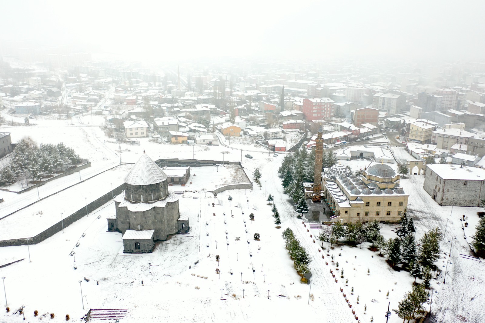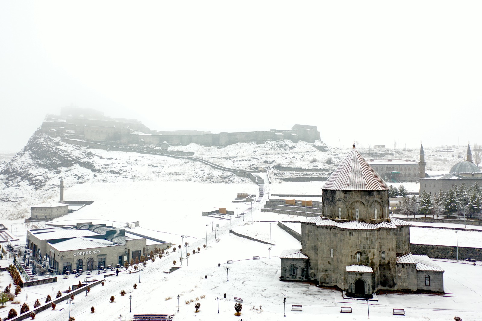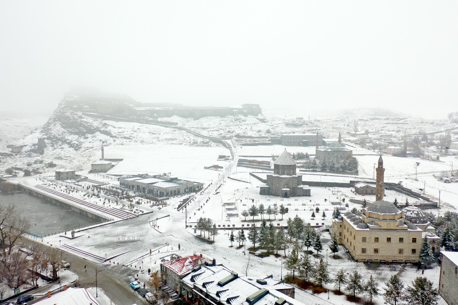 Kars’ta karla kaplanan tarihi yapılar, güzel manzaralar oluşturdu.