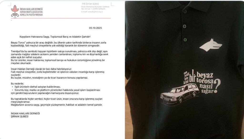 İHD, Trendyol’da satışa sunulan ‘Beyaz Toros’ baskılı tişörtleri eleştirerek, ürünün derhal satıştan kaldırılmasını ve yakınlarını kaybeden aileler ile kamuoyundan açıkça özür dilenmesini talep etti.