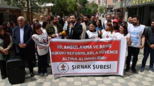 İHD Şırnak Şubesi,Cizre bulunan Mehmet Dilsiz Sanat Sokağı’nda açıklama yaptı. Açıklamaya siyasi parti, demokratik kitle örgütü temsilcileri ve çok sayıda kişi destek verdi. Açıklamada konuşan İHD Şırnak Şube Eşbaşkanı Şıvan Sakman, onurlu bir barış içi yasal düzenlemeler yapılması gerektiğini belirtti.