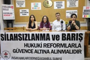 İHD İstanbul Şubesi, İstanbul Beyoğlu’nda bulunan dernek binalarında sürece ilişkin basın toplantısı gerçekleştirdi. “Silahsızlanma ve barış hukuki reformlarla güvence altına alınmalıdır” pankartının açıldığı toplantıya çok sayıda hak savunucusu katıldı. Toplantıda basın metnini İHD Eş Genel Başkanı Oya Ersoy okudu.