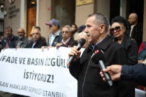 İnsan Hakları Derneği İstanbul Şubesi, gazetecilere yönelik baskılar ve TELE1’e kayyım atanmasına karşı “İfade ve basın özgürlüğü istiyoruz” başlığıyla basın açıklaması yaptı. Eren Keskin, “Cumhuriyetin 102 yılı boyunca gazeteciler susturuldu, çünkü bu coğrafyada bazı konuların konuşulması yasaklandı” dedi.