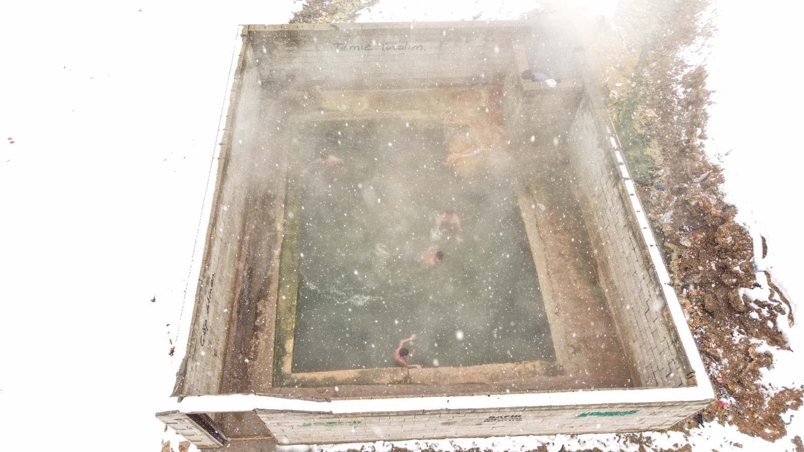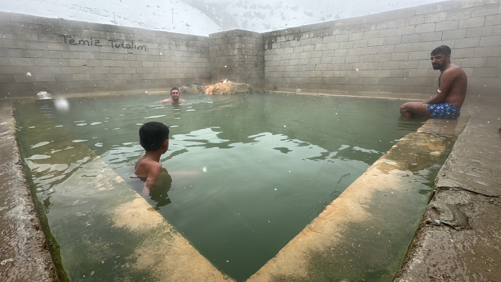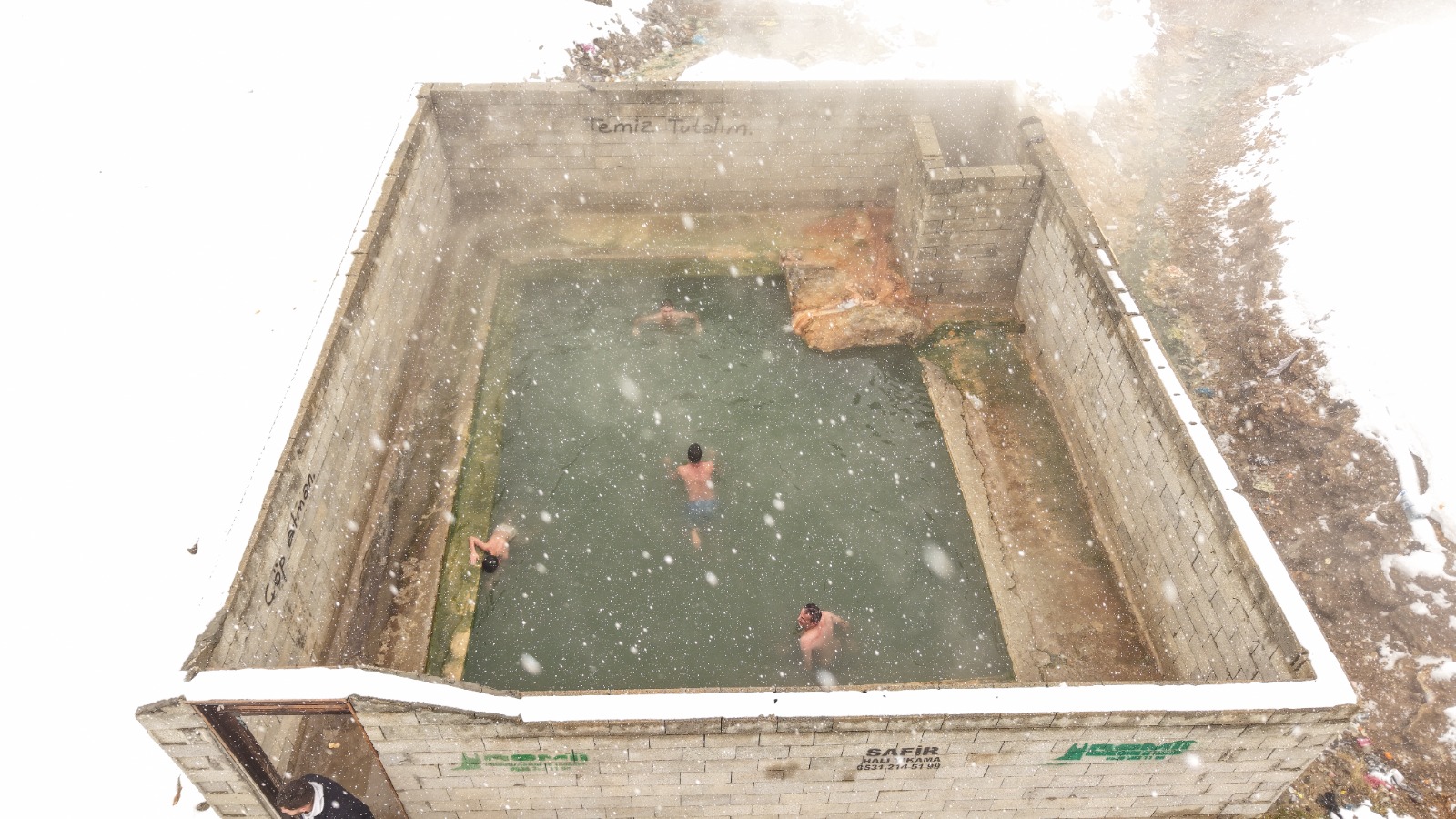 Erciş ilçesindeki termal havuza giren yurttaşlar, kış ortasında sıcak su dolu havuzda yüzüyor