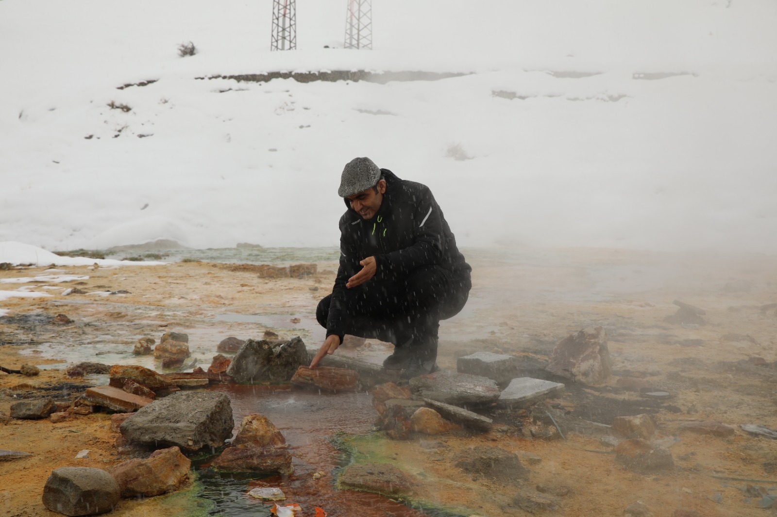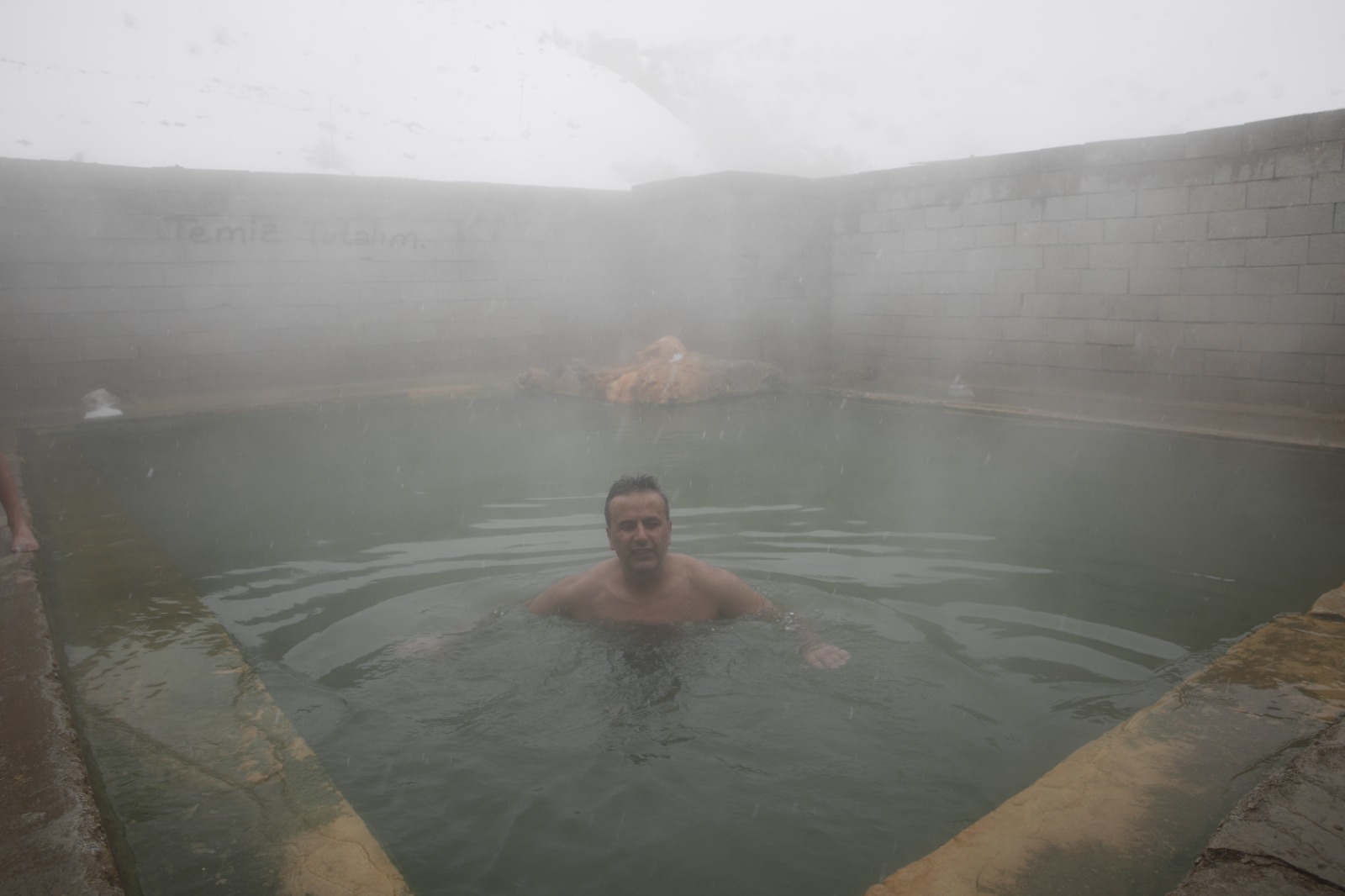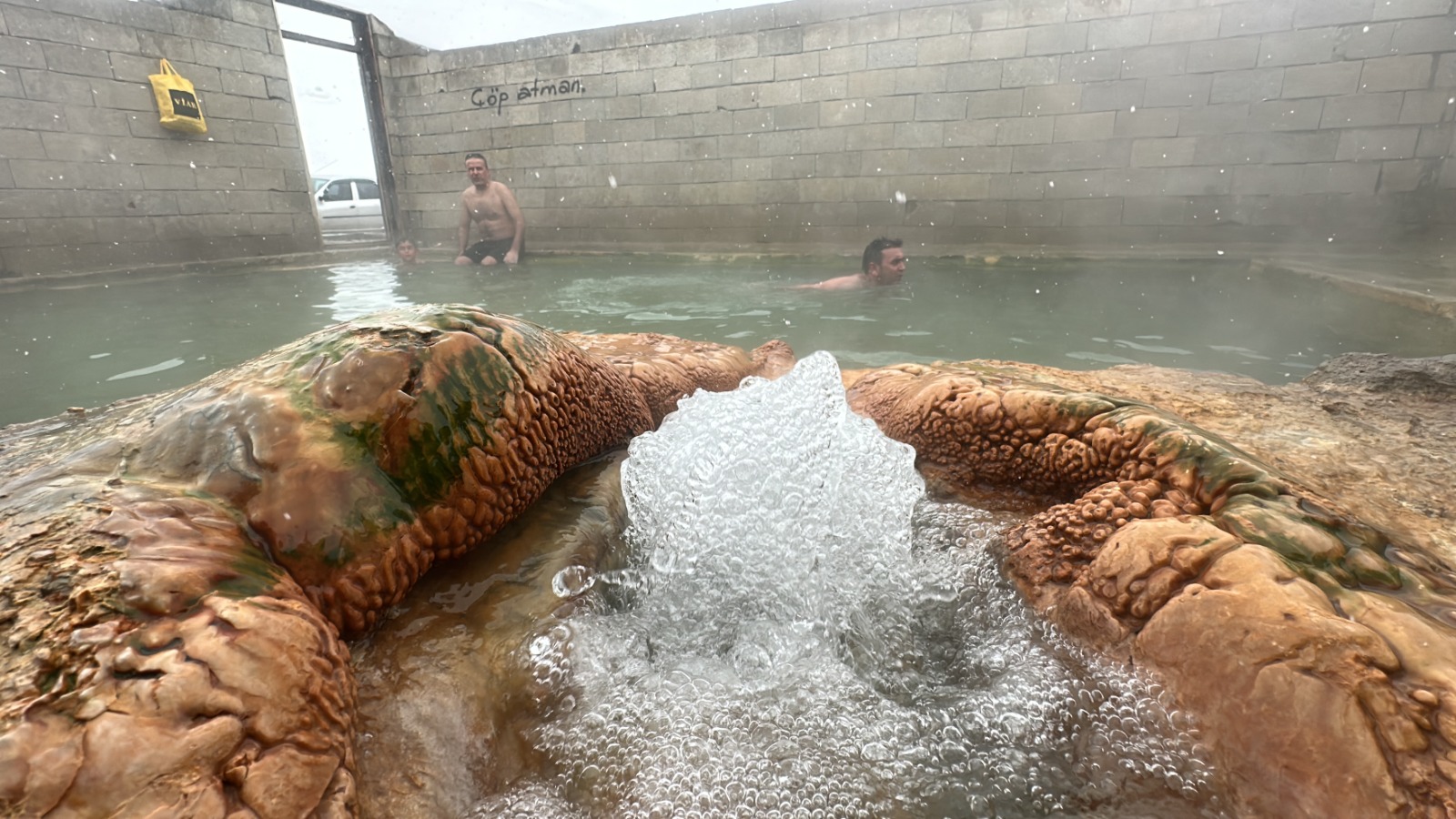 Erciş ilçesindeki termal havuza giren yurttaşlar, kış ortasında sıcak su dolu havuzda yüzüyor