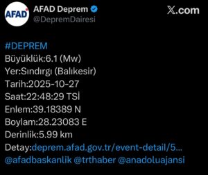 AA muhabirinin Afet ve Acil Durum Yönetimi Başkanlığının (AFAD) internet sitesinden derlediği bilgilere göre, saat 22.48’de Balıkesir’in Sındırgı ilçesinde 6,1 büyüklüğünde deprem oldu.