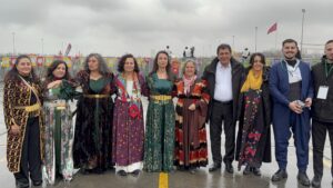 Birçok kişi ulusal kıyafetlerle kutlamalara katıldı, DEM Parti ve DBP bayrakları taşındı.