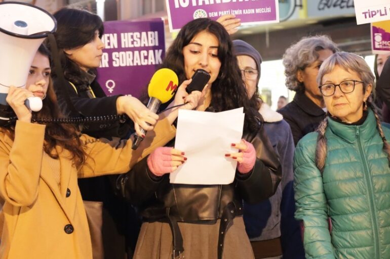 “Bu Saray Rejimi kadın düşmanı politikalarıyla erkeklere cesaret vermektedir. Kadınları aile içine hapsedenlere, önce aile deyip kadınları mezara gönderenlere, İstanbul Sözleşmesi’nden çıkanlara sesleniyoruz: Bu kanlı düzeni kabul etmiyoruz. Öldürülen her kadının hesabını soracağız. Biz İzmir Kadın Platformu olarak buradayız. Öfkeliyiz, isyandayız ve haklıyız. Biliyoruz ki kurtuluş tek başına değil; kurtuluş yan yana gelmekte, kurtuluş örgütlü kadın mücadelesinde. Yaşam hakkımızdan vazgeçmiyoruz. Hesap soruyoruz ve bu mücadeleden bir adım bile geri atmıyoruz.” (MA)