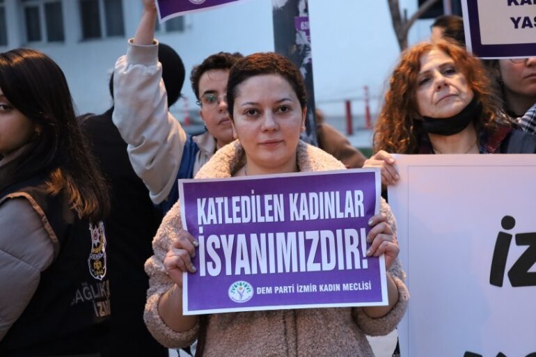 Sadece son haftada 3’ü İzmir’de olmak üzere 4 kadının öldürüldüğünü belirten Rabia Taşdemir, savaşın, erkek egemen düzenin kadınlara yönelik şiddeti meşrulaştırdığı zeminlerden biri olduğunu söyledi.