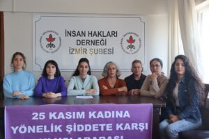 İHD İzmir Şubesi Kadın Komisyonu, 25 Kasım Kadına Yönelik Şiddete Karşı Uluslararası Mücadele Günü dolayısıyla basın toplantısı gerçekleştirdi. Dernek binasında gerçekleştirilen toplantıya çok sayıda kadın katıldı. Basın metnini komisyon adına İHD İzmir Eşbaşkanı Zilan Gümüş okudu.