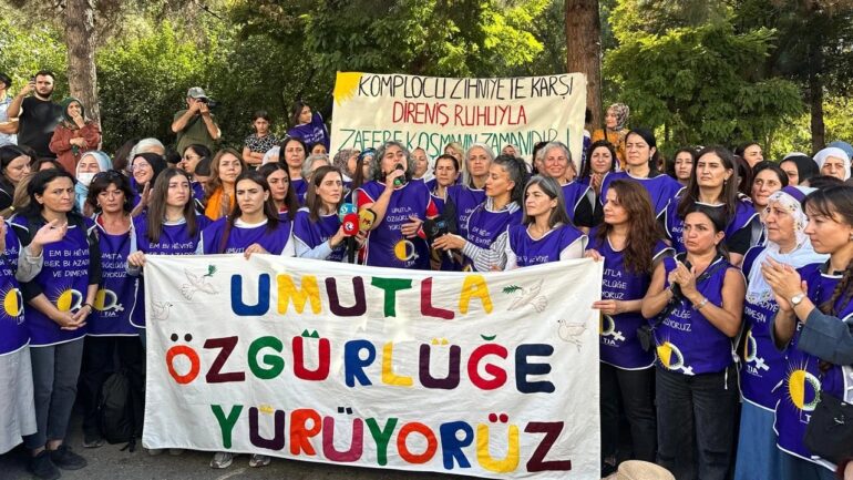 Burada yapılan açıklamada, Özgür Kadın Hareketi aktivisti Sabahat Tuncel, barış çağrısı yaparak Abdullah Öcalan’ın çözüm sürecindeki rolüne dikkat çekti.