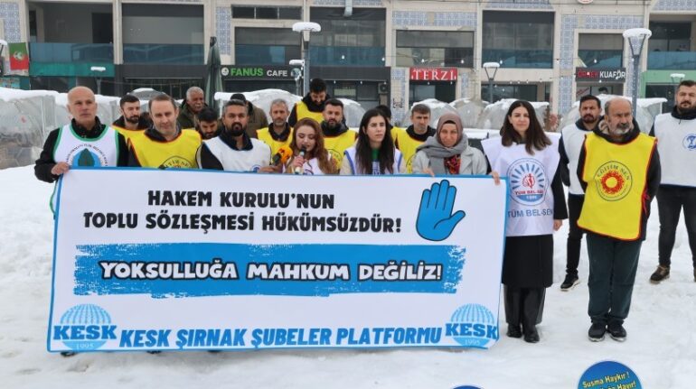 Şırnak’ta iş bırakan KESK Şırnak Şubeler Platformu birleşenleri, Cumhuriyet Meydanı’nda bir araya geldi. Emekçilerin eylemine siyasi parti ve demokratik kitle örgütü temsilcileri destek verdi. Eylem alanına “Hakem kurulunun toplu sözleşmesi hükümsüzdür! Yoksulluğa mahkum değiliz” pankartı ile “Savaşa değil emekçiye bütçe”, “Grevli toplu sözleşme” ve “İnsanca ücret insanca yaşam” dövizleri asıldı. Meydanda kürsü kurularak, el bildirileri dağıtıldı. Uzun süre meydanda eylemlerini sürdüren emekçiler, ardından açıklama yaptı. Açıklamayı yapan Sağlık ve Sosyal Hizmet Emekçileri Sendikası (SES) Şırnak Şube Eşbaşkanı Samet Kaya yaptı.