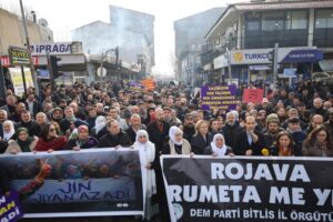 Demokratik Bölgeler Partisi (DBP) Eş Genel Başkanı Keskin Bayındır’ın katılımıyla Güroymak’ta (Norşîn) bir yürüyüş ve basın açıklaması gerçekleştirildi. Siyasi parti temsilcileri ve çok sayıda yurttaşın katıldığı yürüyüşte, sınırın ötesinde yaşayan halklara yönelik tehditler ve insani yardımın önündeki engeller protesto edildi.