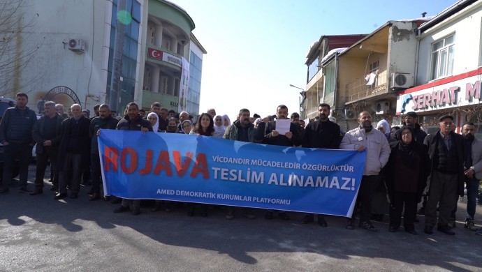 Açıklamada sık sık “Biji berxwedana Rojava”, “Jin jiyan azadî” sloganları atılırken “Rojava vicdandır, direniştir, özgürlüktür teslim alınamaz” pankartı açıldı.