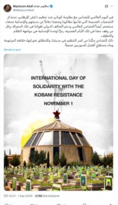 Abdi, X hesabından yaptığı paylaşımda, “Kobani’deki fedakarlıkları” andı ve uluslararası desteğin önemine” vurgu yaptı.