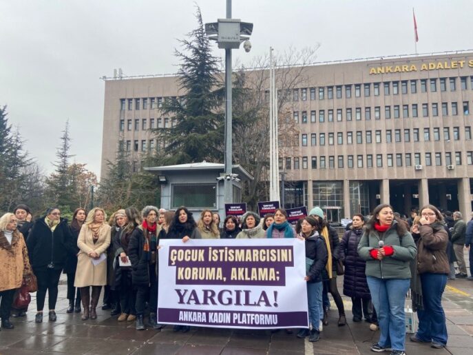 Kadınlar, adliye önünde yapılan basın açıklamasında, “Çocuk istismarcısını koruma, aklama yargılı” yazılı pankart açtı. Kadınlar yaptıkları basın açıklaması esnasında sık sık, “Çocuk istismarı politiktir” sloganı attı.