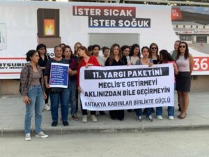 “Güvenli alanlarda yaşamak hepimizin hakkı. Topyekûn halkın her kesimini etkileyecek bu yasa tasarısı meclise getirilemez. Çocukların 16 yaşında zorla evlendirilmesine de yetişkin gibi yargılanmasına da kölece çalıştırılmasına da bir insanın kendi bedeni hakkında karar verebilmesi için 25 yaşını beklemesinin dayatılmasına da itiraz ediyoruz. Bugün buradan yetkililere ve kamuoyuna sesleniyoruz; mücadelelerimizle kazandığımız hiçbir hakkın elimizden alınmasına izin vermeyeceğiz. Halk düşmanı 11’nci Yargı Paketi’ni meclise getirmeyi aklınıza bile geçirmeyin.”