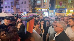 Polis, açıklama esnasında sık sık gruba müdahale ederek LGBTİ+’ları temsil eden gökkuşağı bayrağını almak istedi.