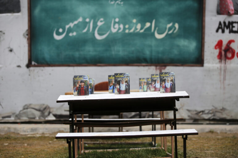 Venek Meydanı’nda kurulan temsili bir sınıfta, ABD’nin öldürdüğü Şeceretü’t-Tayyibe Kız İlkokulu öğrencilerinin fotoğrafları yerleştirildi.