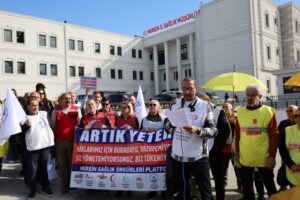 Mersin Sağlık Platformu, İl Sağlık Müdürlüğü önünde açıklama yaptı. Açıklamada “Artık yeter haklarımız için buradayız, vazgeçmiyoruz. Siz yönetemiyorsunuz biz tükeniyoruz” pankartı açıldı. Açıklamayı yapan Mersin Aile Hekimleri Derneği İbrahim Önge, iktidarın sağlıkçılara verdiği sözleri tutmasını istedi.