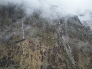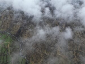 Bölgedeki vadiden geçen akarsu, sisle kaplı dağlar ve şelaleler, dronla kaydedildi.